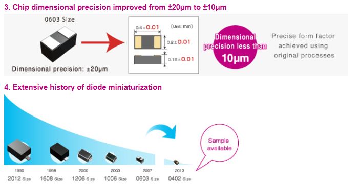 In general, with diodes there is a reciprocity between chip size and electrical characteristics. In order to break this relationship, an original chip device structure, along with high precision machining technology, was utilized to develop an ultra-thin, ultra-compact form factor that maintains the key characteristics of 0603-size products, such as VF.