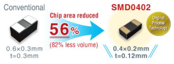 1. The world’s smallest size (0402 – 0.4mmx0.2mm) achieved using original process technology