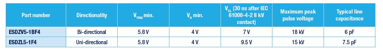 ST’s new 0.6 x 0.3-mm single-line ESD-protection diodes quickly clamp transients to a low voltage thanks to their snap-back technology with 5.8 V trigger voltage. With a respective capacitance of 7.5 pF and 6 pF, both the unidirectional ESDZL5-1F4 and the bidirectional ESDZV5-1BF4 ensure high-speed signal application compatibility for space-constrained smart objects.